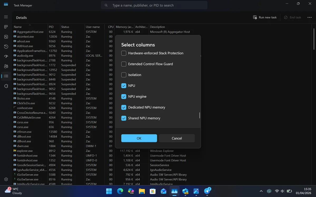 除了基础监控,微软还为专业用户提供了更精细的数据。在“详细信息”页面,用户可以额外添加“NPU 专用内存”和“NPU 共享内存”列,深度洞察 AI 工作负载的内存调度情况。
